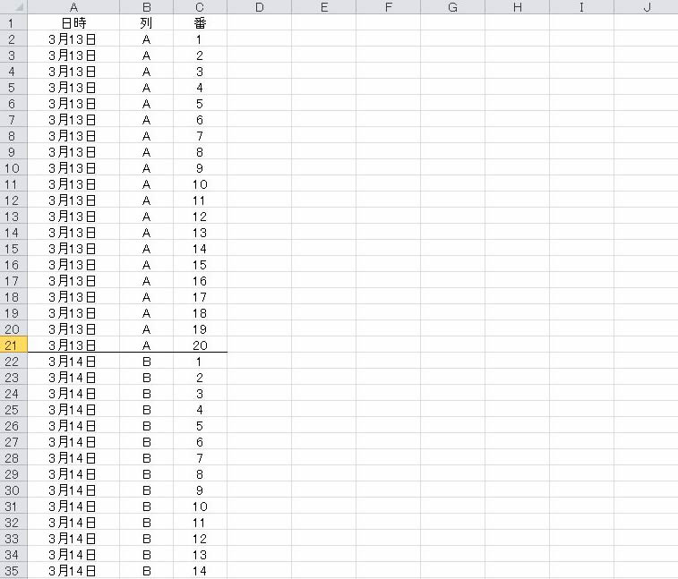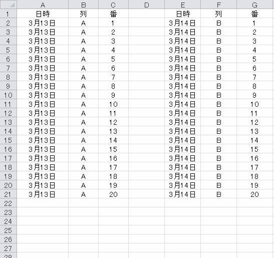 しかし、座席指定チケットを作るのに必要なのは流し込むデータですので、列が変わってしまっては連続してデータを流し込むことができません。