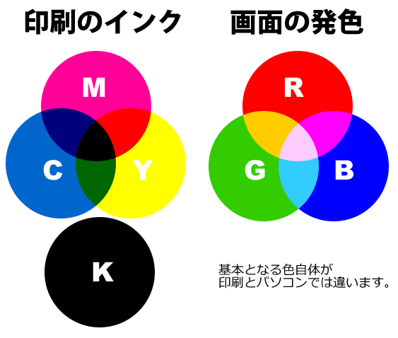 モニターの画面は、RGBという方式で色を表現しており、印刷はCMYKという方式で色を表現します。理論は別にして、色の表現方法が違うため、印刷では画面より沈んだ色合いになります。