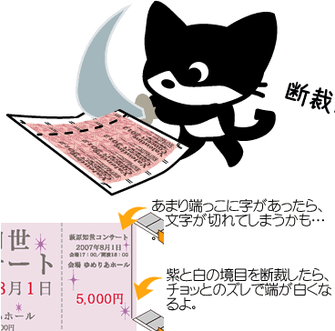 こんなみっともないチケットにならないために必要なのが塗り足しと呼ばれる、仕上がり位置の外側の部分で、この塗り足し部分を切り落として仕上げる作業を裁ち落としと呼びます。
