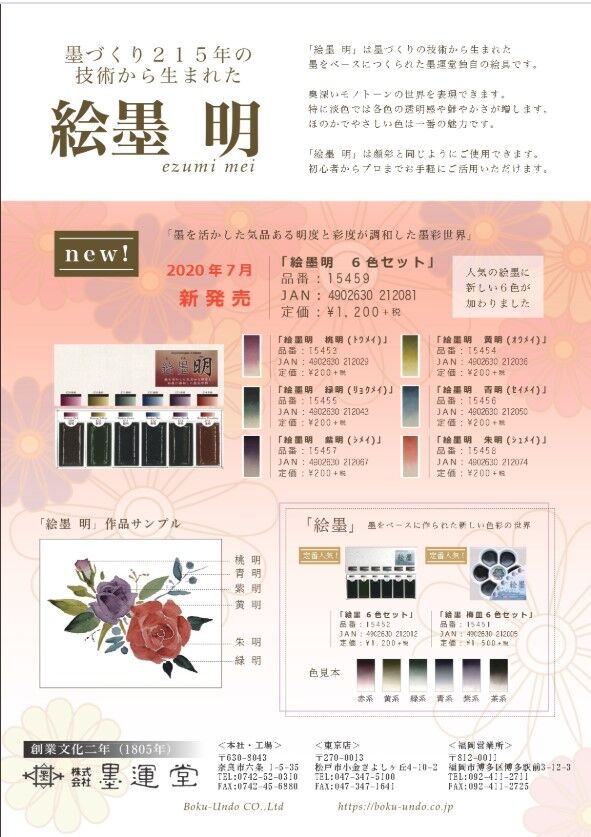 新規取扱商品のご案内墨運堂・絵墨 明墨づくりの技術から生まれた墨をベースにした墨運堂独自の絵具です奥深いモノトーン世界を表現できほのかでやさしい色合いが魅力です姉妹品で・絵墨6色セットもございます