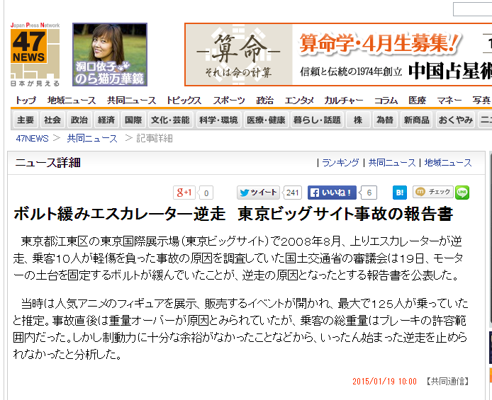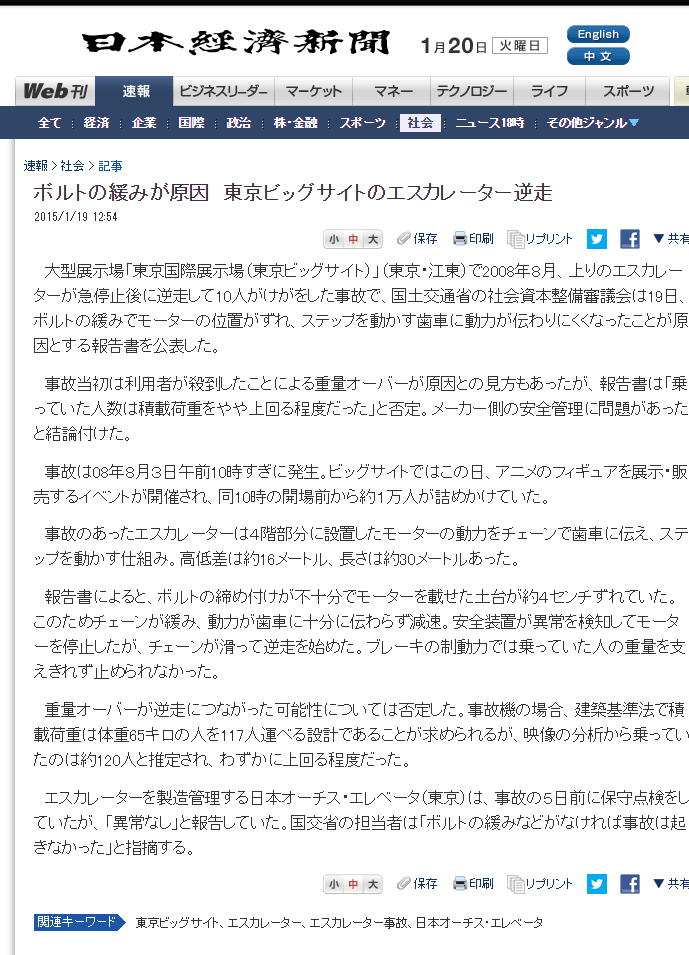 3日午前、東京・江東区にある「東京ビッグサイト」で、およそ120人が乗っていた上りのエスカレーターが突然止まり、一部の人が転倒したりして10人が軽いけがをしましたなお、GIGAZINEさんでは「人が多すぎてエスカレーターがぶっ壊れて逆流」と書かれているけど、ワンフェスが過去にビッグサイト西館で開催された時と、乗ってた人の数は変わらないような気がする。 あと、毎日新聞には『調べでは、エスカレーターは、計1万1180キロの荷重に耐えられる設計で、それをオーバーすると自動停止する仕組み』と書いてあるけど、実際にエスカレーターに乗っていて無傷ですんだ人いわく「突然エスカレーターが逆回転した」とのこと。