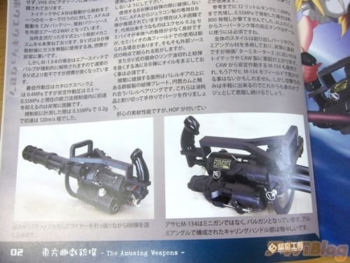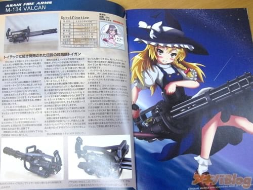 紹介されているのは、アサヒファイアーアームズ「M-134 VALCAN」、スモーキーズガンファクトリー「BARRETT M82A1」、GUNZE INDUSTRY「SOCIMI SMG821」、Toy-tec「CALICO M100P」、B.W.C「VEKTOR CP1」、東京マルイ「Browning HP」、東京マルイ「S&W M59」、タニオコバ「H&K USP」、HUDSON INDUSTRY「CHECK MATE」、HUDSON INDUSTRY「M14 MILITARY MODEL」の10種(裏表紙)で、それらトイガンの外観写真・スペック・特徴や、東方キャラクター×トイガンのイラストを収録した解説同人誌。