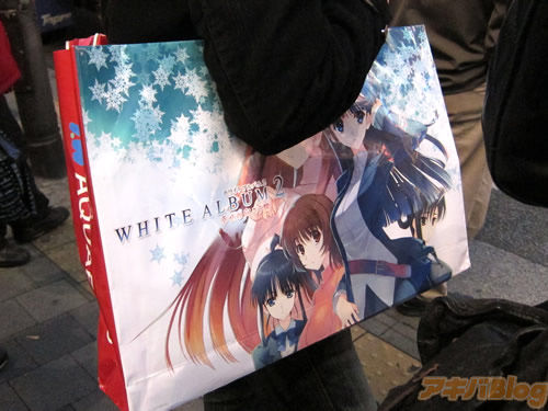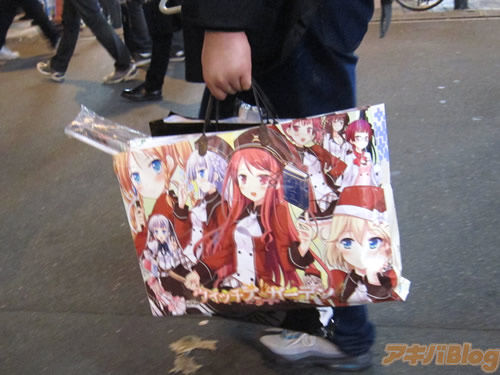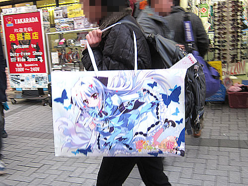 2012年冬のコミックマーケット初日&2日目の秋葉原で見かけた紙袋の傾向は、2日目が雨だった影響もあるかもしれないけど、2012年の夏コミの時の半分程度だった印象。また、尼マイクさんのツイートで話題になった、美少女ゲームメーカーパープルソフトウェアブースの「幼女と手を繋げる紙袋」は発見できなかった(ほかの袋に中にいれてるのかも)。また、「股間を掴める紙袋」も秋葉原で手に持って歩いてた人は見かけず。