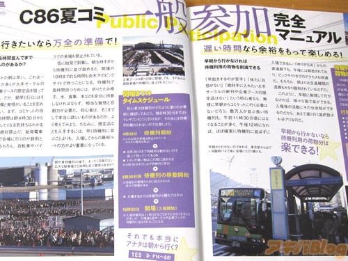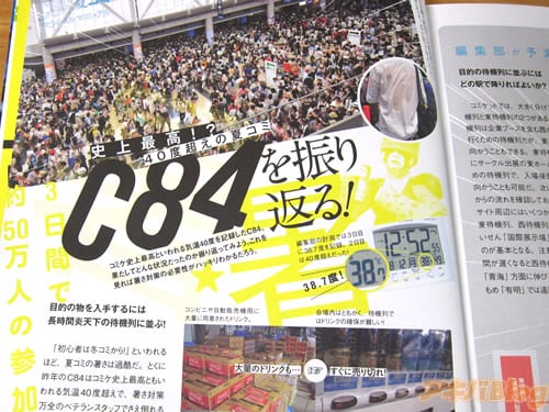 また、巻頭特集の『集中講座C86 夏コミサバイバルマニュアル』では、マナー・ルールについてや、来場時間別待機マニュアル、C86の開場待機列予想、会場での体調管理、熱中症対策などで、40度を超える猛暑だった去年の夏コミ(C84)の様子とかも収録している。