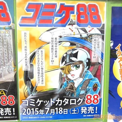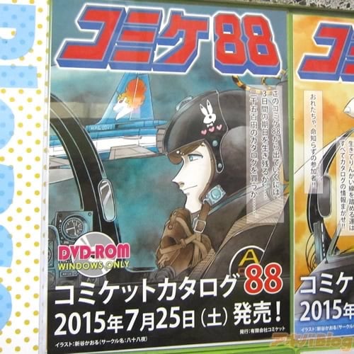 東京ビッグサイトで8月14日〜16日に開催される2015年夏コミ・コミックマーケット88のカタログは、冊子版【AA】の発売が18日(土)、DVD-ROM版【AA】が25日(土)発売で、表紙イラストは新谷かおる氏(サークル八十八夜)のエリア88になるみたいで、アキバ各店のショップ特典はこんな感じ。