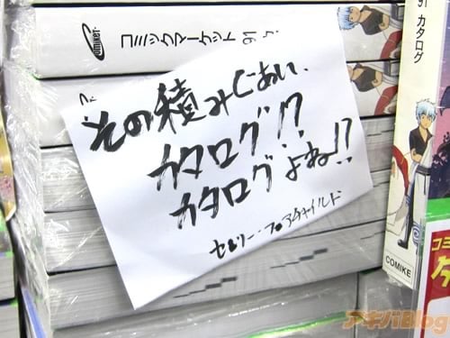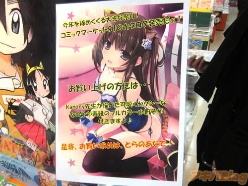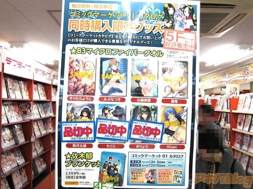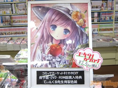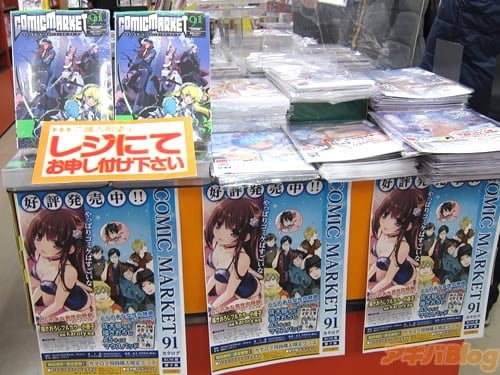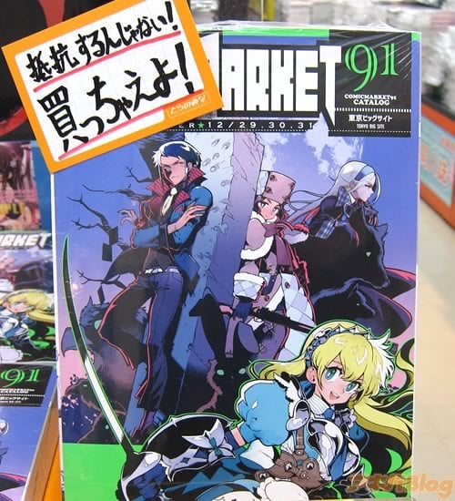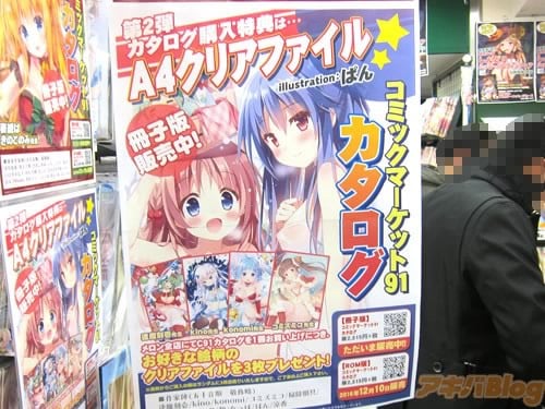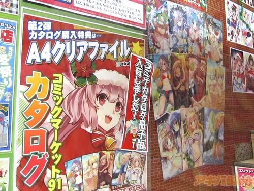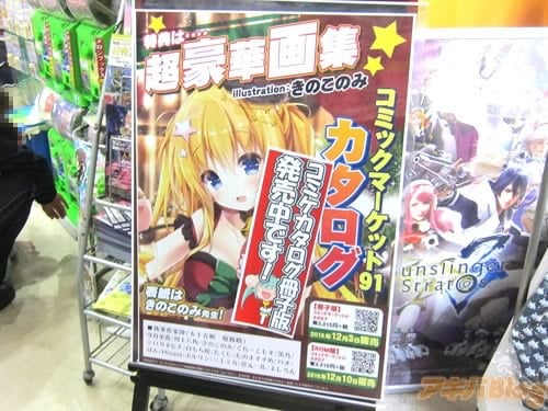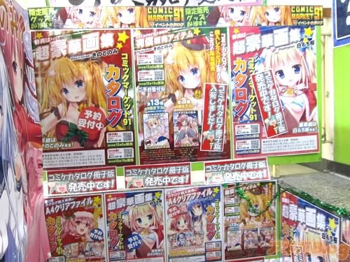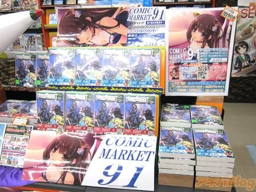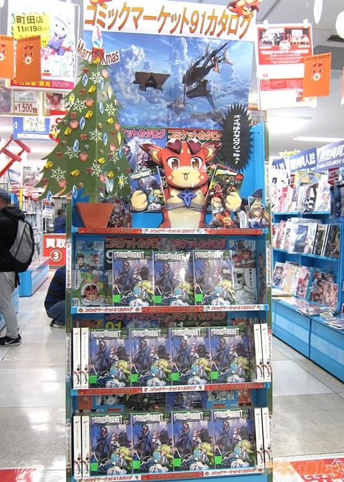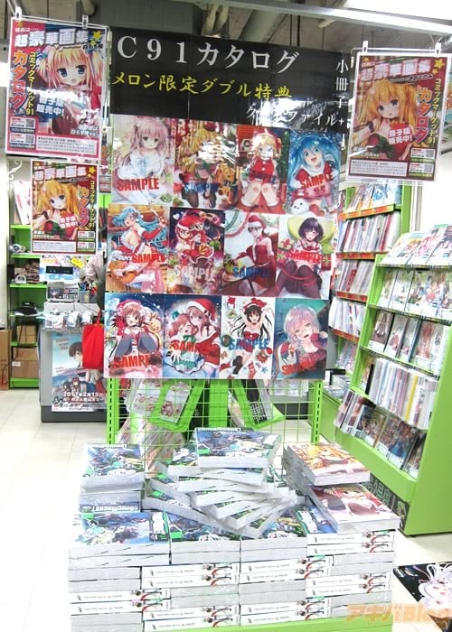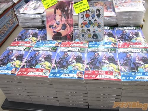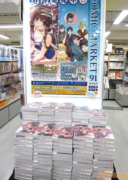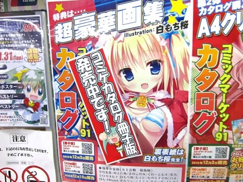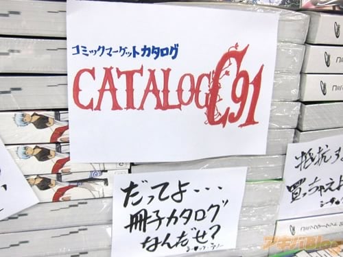 カタログ冊子版発売日のアキバでは、とらのあな秋葉原店Aで『コミケも今回で91回目!ということで九一式徹甲弾(大和型戦艦46センチ砲)をほぼ実物大で作ってみました!』というPOPとともに九一式徹甲弾を売り場に鎮座させていたり、メロンブックス秋葉原1号店ではコミケタイトルの天井タワーを作って、"機動戦士ガンダムF91"オマージュのPOP『抵抗するんじゃない!買っちゃえよ! シー◯ック』、『コイツは…分厚すぎる! シーブ◯ク』、『その積みぐあい…カタログ!?カタログよね!? セ◯リー』とかが付いて、メロン入り口にもF91っぽいのがいた。