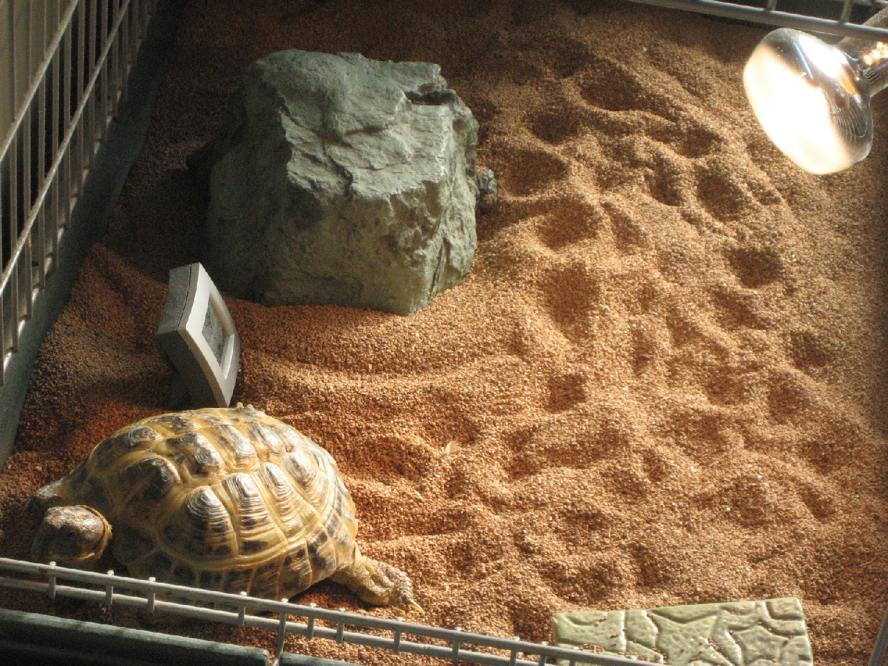 夜用の(本当かどうか疑っているが)爬虫類には見えない明かりを出す保温用ライトが取り付けられている。