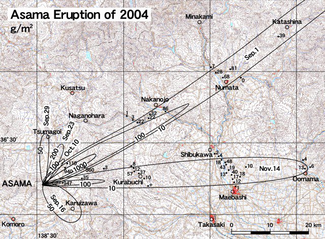 Y. Hayakawa @HayakawaYukio 2017-01-24 11:08:40浅間山の2004年噴火では、高速道路に50g/m2程度の積灰があった。9月1日沼田、9月16日軽井沢、11月14日前橋。50g/m2は、厚さにすると0.05ミリ。この程度だと高速道路は通行止めにならない。 pic.twitter.com/D2w2hHWlBC