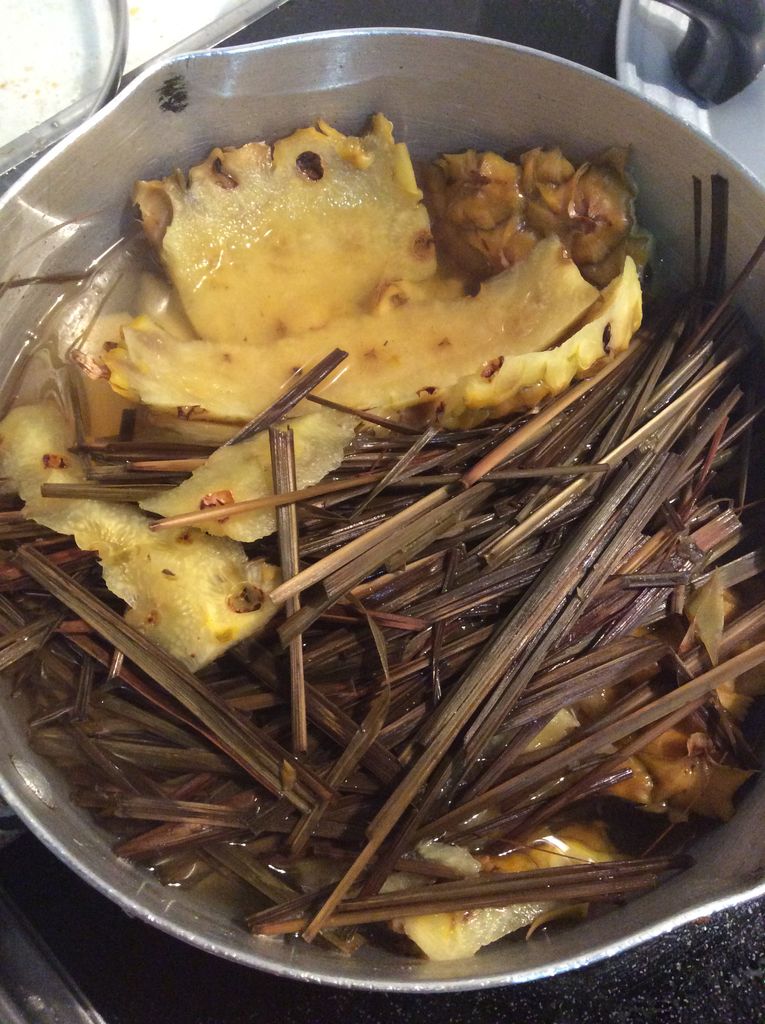 鍋にパイナップルの皮とレモングラスとレモン汁を入れ、