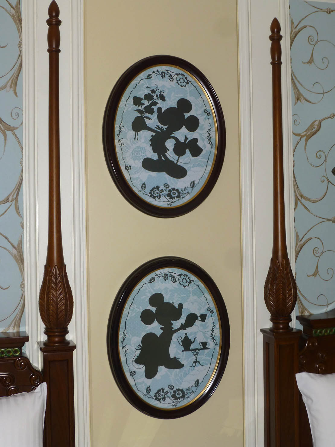 シルエットの ミッキーマウスと ミニーマウスの まぁるい 額縁が 掛かってマツ。