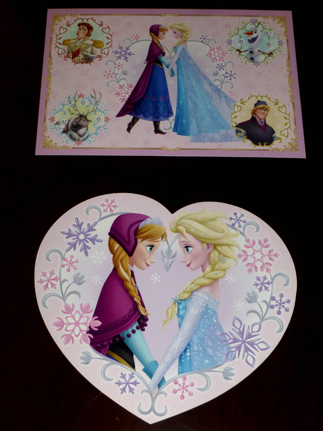 ハートの 縁飾りは 透明のフタ部分に 描かれてイテ、アナとエルサは ウシロの紙に 描かれてマツな。 (゚ー゚)(。_。)