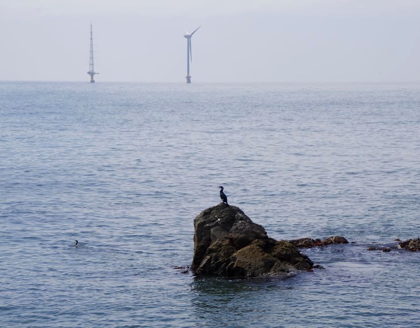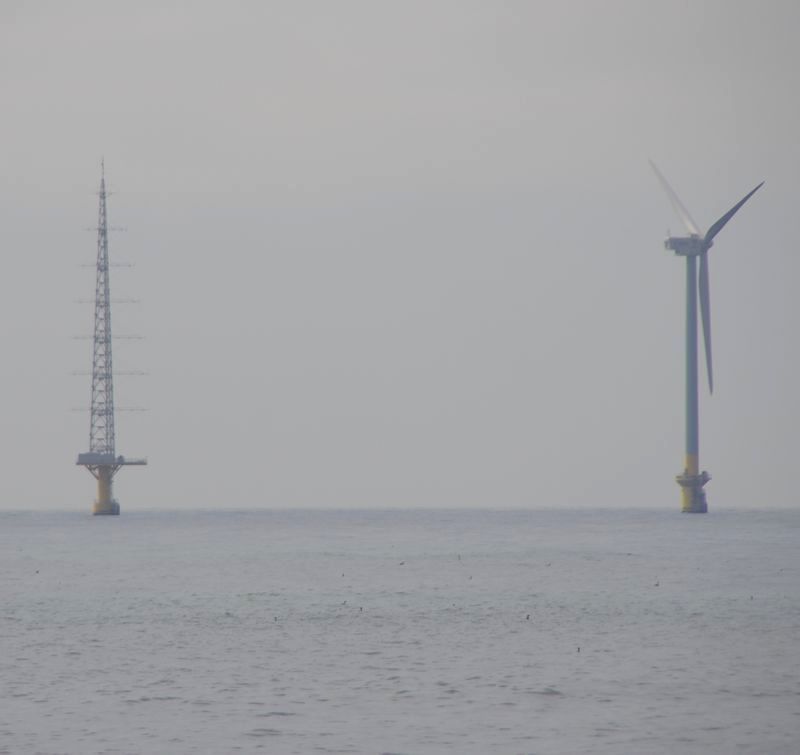 あまりにも遠くて小さいですが、よく目立ちます。なお、左側の鉄塔は洋上風況観測タワー。