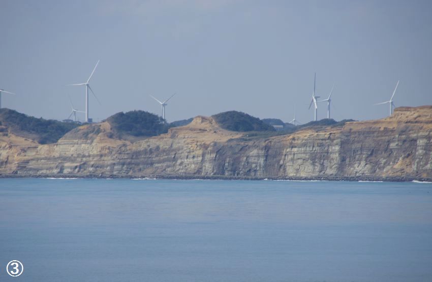 でも、風景としては魅力的なので海上の風車を入れながらの千騎ヶ岩(せんがいわ)を紹介します(画像は拡大できます)。