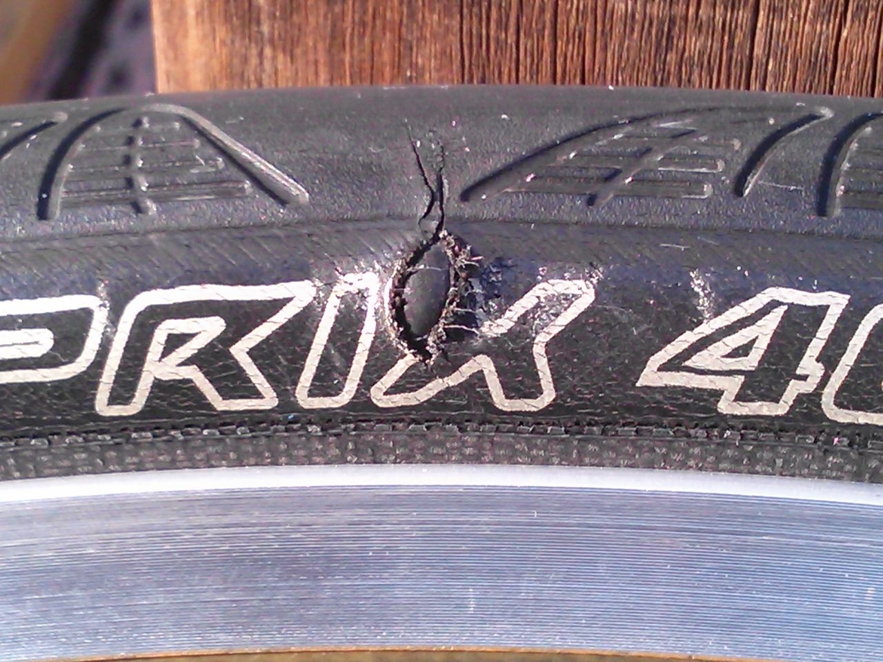 サイドに亀裂、下からチューブが膨れているのが見えます。