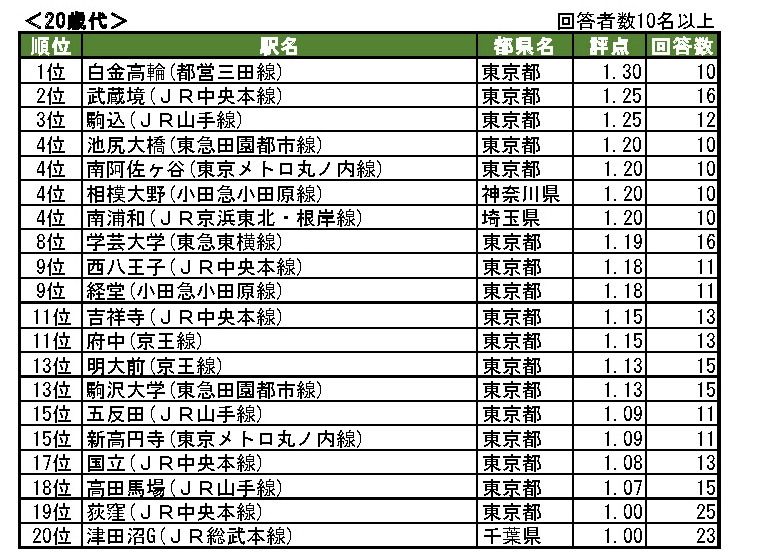 20歳代、30歳代、40−50歳代、60歳以上に分けているが、注目したいのは、武蔵境が20歳代で2位になっていることだ。吉祥寺の11位よりもランクが高い。