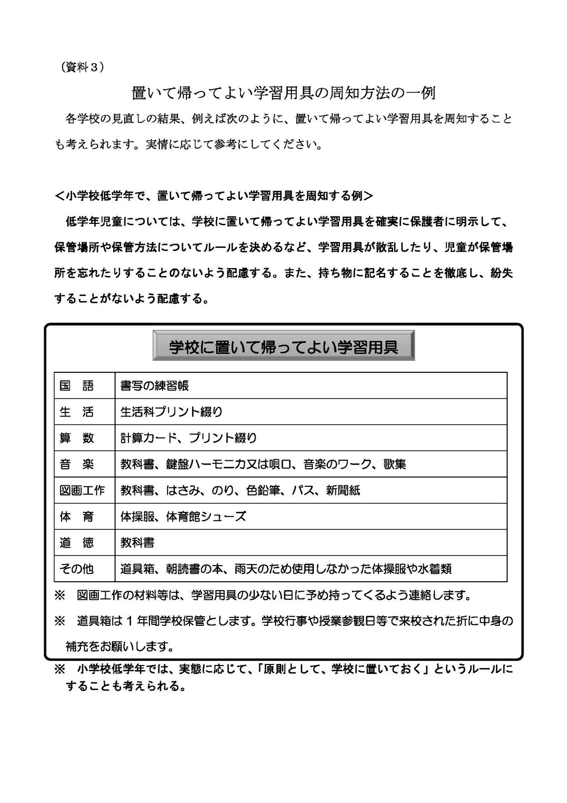 これらの結果や保護者意見や中学校の生徒の意見も取り入れて負担軽減のあり方を検討し、対応策を学校便りなどで保護者に周知。さらに、具体的に学校へ置いて帰ってよい学習用具を示している。