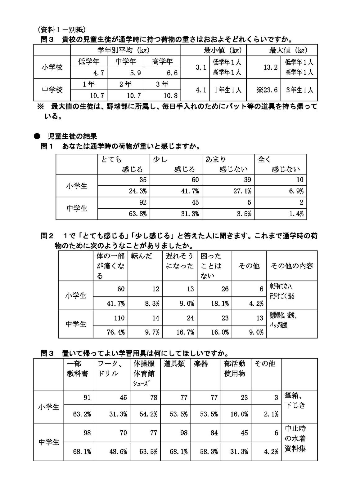 小中学生に感想も聞いており、小学生で通学の荷物を「とても重い」「少し感じる」の答えを合わせると、66%が重いと感じていることが分かる。