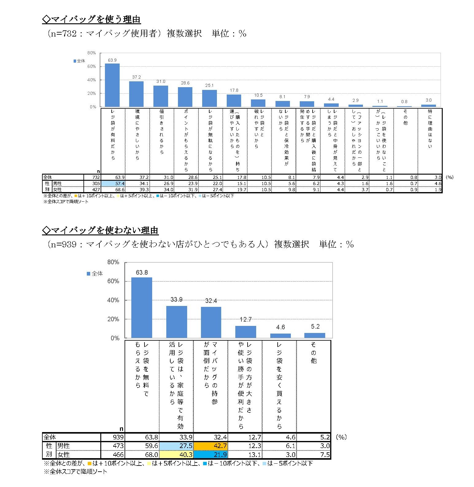 スーパーでマイバックを使う人は約7割に達し、使う理由の一位は「レジ袋が有料だから」が約6割と最も多いことが分かった。有料化が後押ししていることが分かる。