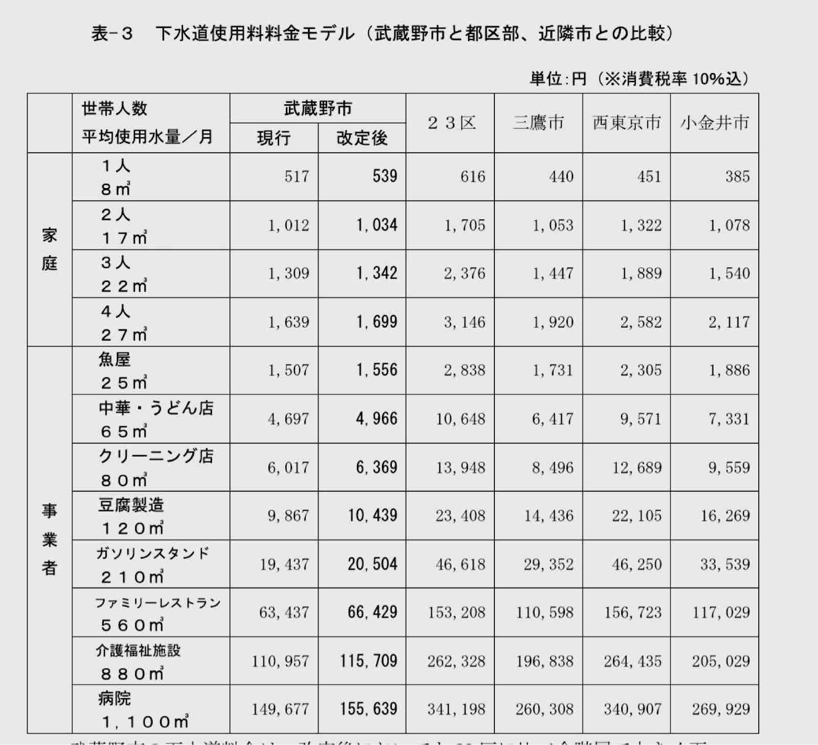 委員会では大規模事業者の料金を上げるべきではないかと指摘があったが 、武蔵野市は30立方メートル以下の小口使用が約9割となっているため大口には頼れず幅広い負担額必要と判断しての今回の案となったと説明があった。