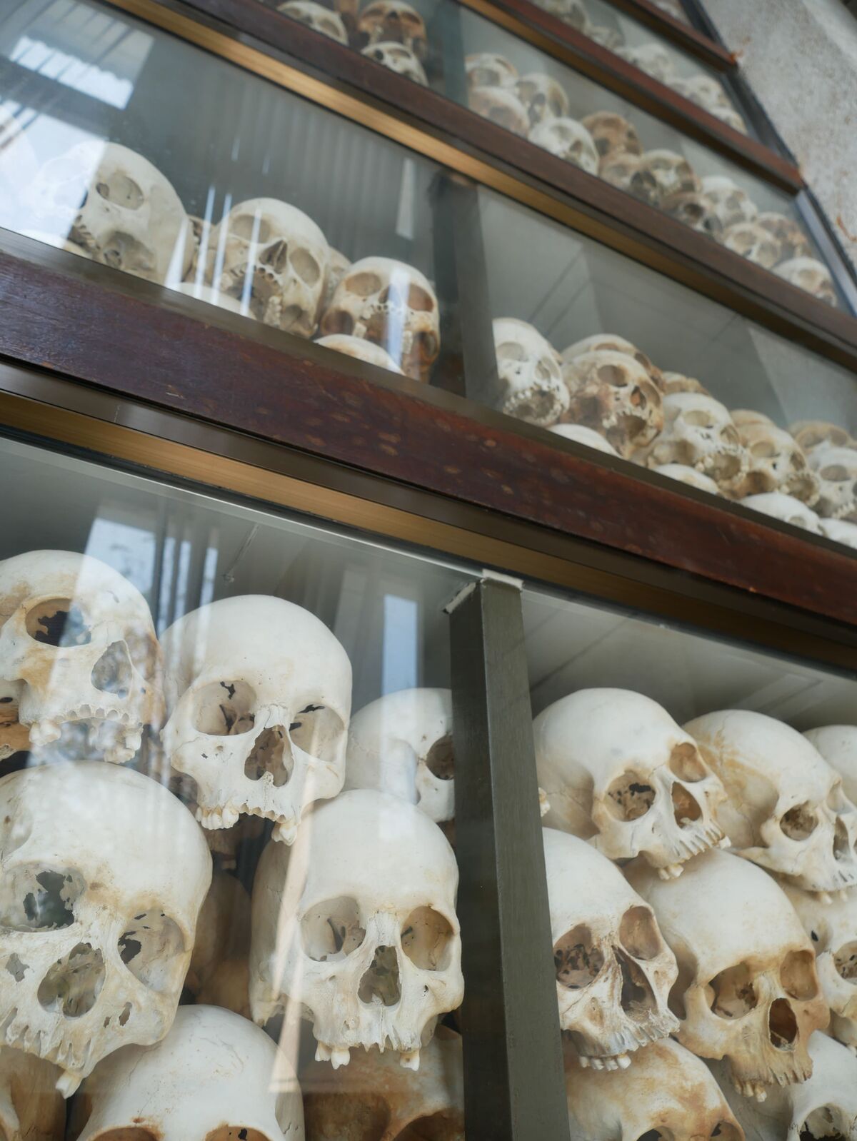 そのキリングフィールドは、国内に300か所あったとされる。そのうちの二か所を訪れたのだが、現地には供養塔が建てられ、その中には犠牲者となった方々の頭蓋骨だけが納められていた。他の体の骨までは収容しきれないのだそうで、別の場所に保管されているという。