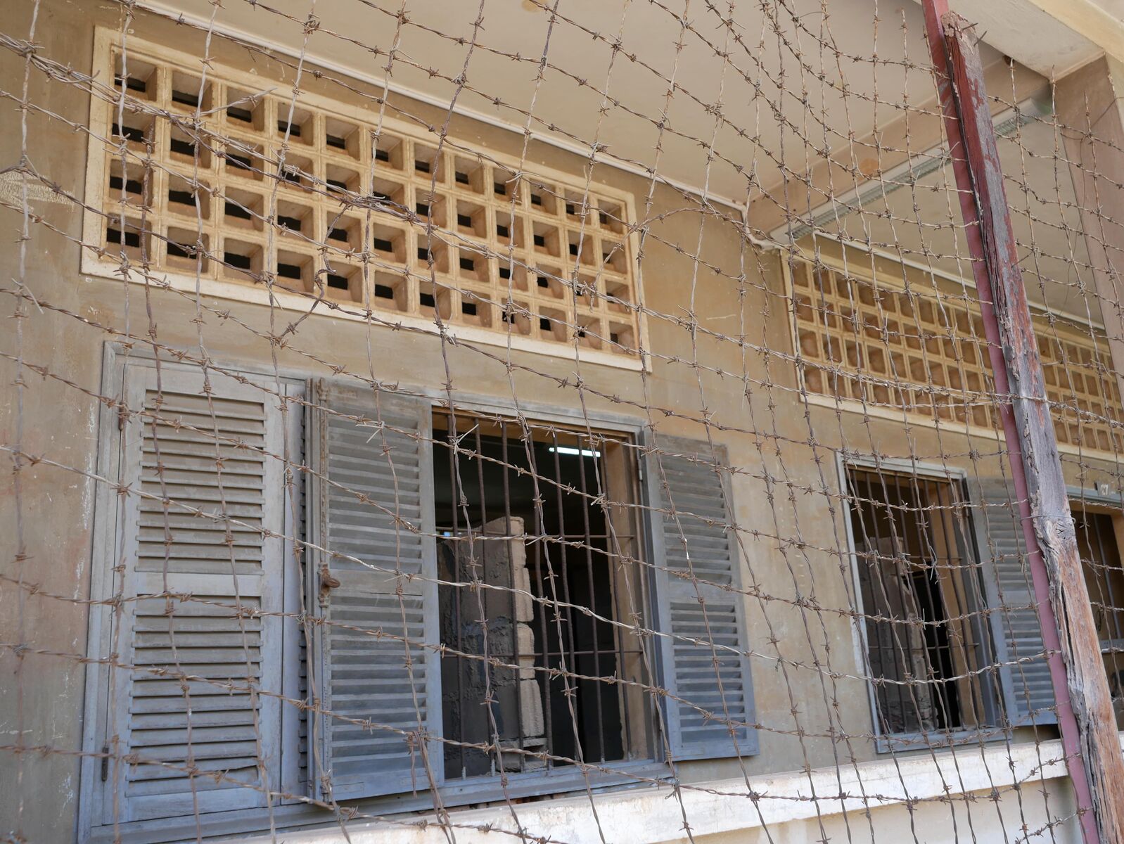 ・トゥールスレン虐殺博物館の独房。鉄条網は外部からの侵入者を防ぐのではなく自殺者出さないためのもの。死なさず虐待を続けることが自白へとつながると説明されていた。死んだほうがましとの証言もあり