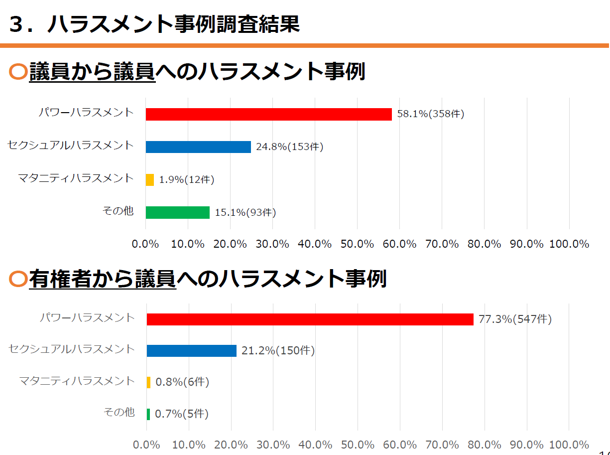 ハラスメントの内容は、パワハラが68.4%。セクハラが22.9%。マタハラが1.4%。その他が7.4%。議員から議員、有権者から議員へのハラスメントの内容は下記だった。