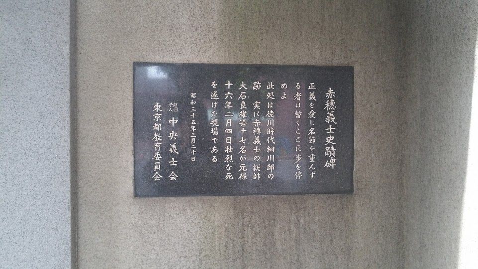 さて、気分をとりなおして進みます。ルートをすすみ、ちょっとずれるのですが、脇にはこの一帯が旧細川家の下屋敷の一部、そして赤穂浪士事件の重要な場所だったことを示す『大石良雄外十六人忠烈の跡』という記念碑があります(下のgoogle mapには記しておきます)。