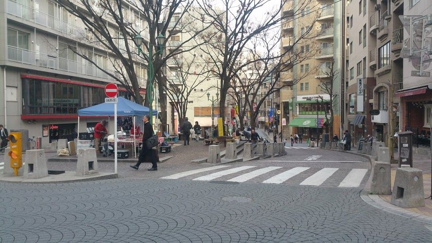 お寺の前の雑式通りをまっすぐいくと⑨麻布十番商店街です。中心街は一の橋のほうで、このルートだとだいぶ奥のほうという感じです。この中央にある麻布十番広場(パティオ十番)を中心に広がる空間はいつみても良いもんですね。道路の文様や連なる木々をみると欧米にきたかのような雰囲気があります。