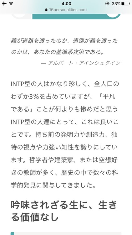 かなり珍しく、全人口のわずか3%を占めていますが、「平凡である」ことが何よりも惨めだと思うINTP型の人達にとって、これは良いことです。
