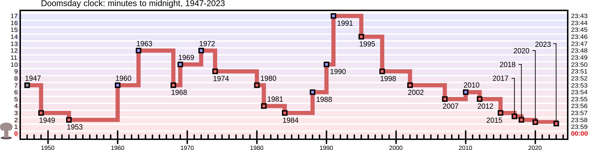 「トランプの発言で30秒縮むのに、ウクライナ戦争では10秒しか縮まないとかw」みたいに言っているやつは、何も本質を捉えられていない。「何秒縮んだか」ではなく「今、何秒か」が重要なのであって、この時計自体はそう読むべきではないのか。