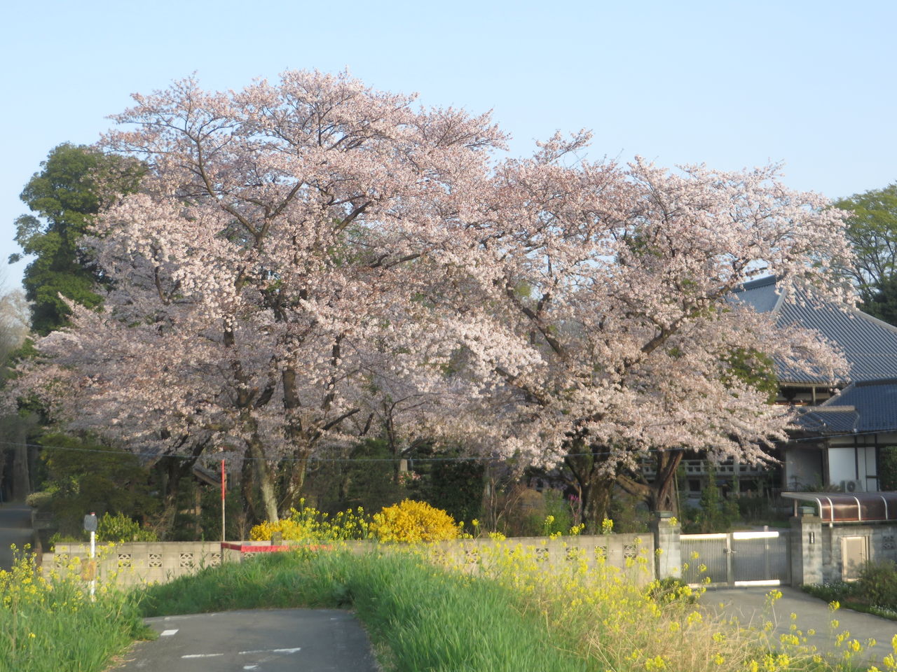 サイクリングロードから眺めた泉福寺の桜、菜の花とよく合っています。