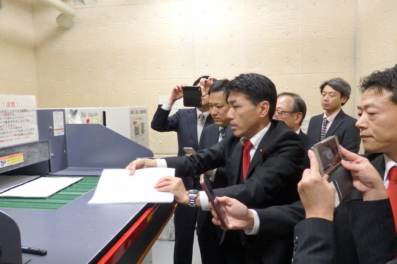 内閣府にある大型シュレッダーを視察する野党議員=立憲民主党提供