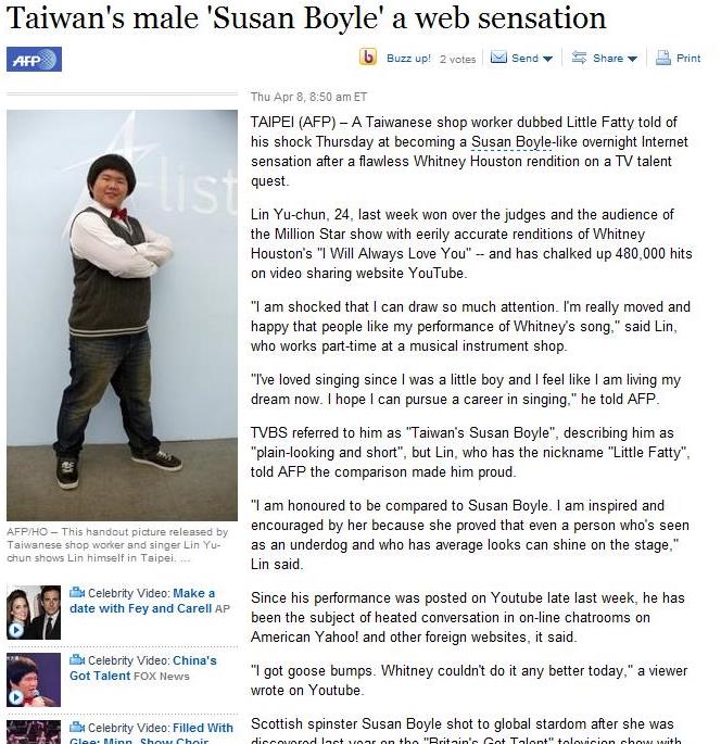 ただ、「台湾の男スーザン・ボイル」と書いてあるのに、どうして日本のニュースでは「中華版スーザン・ボイル」になってしまうんでしょう?