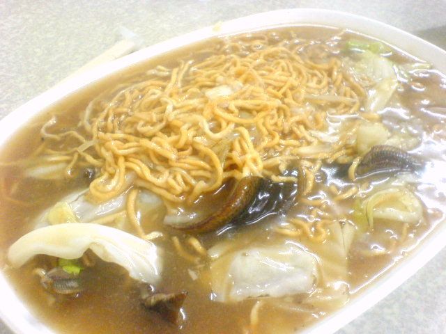 (魚善)魚意麺是炒(魚善)魚跟高麗菜, 加酸酸甜甜的勾欠(我知道寫錯字, 因為亂碼, 故意的), 放在意麺上的料理。意麺有點像日本的硬炒麺。