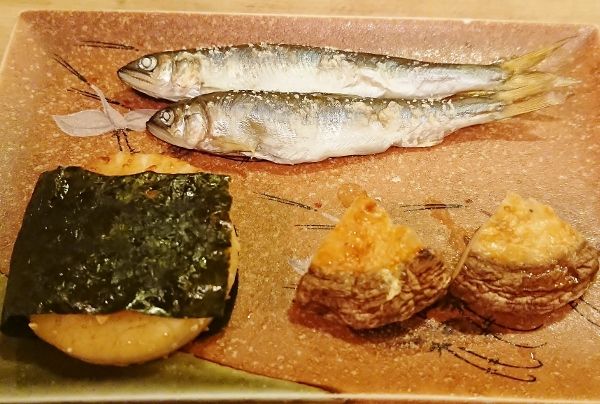 稚鮎、帆立磯辺焼き、海老×椎茸。
