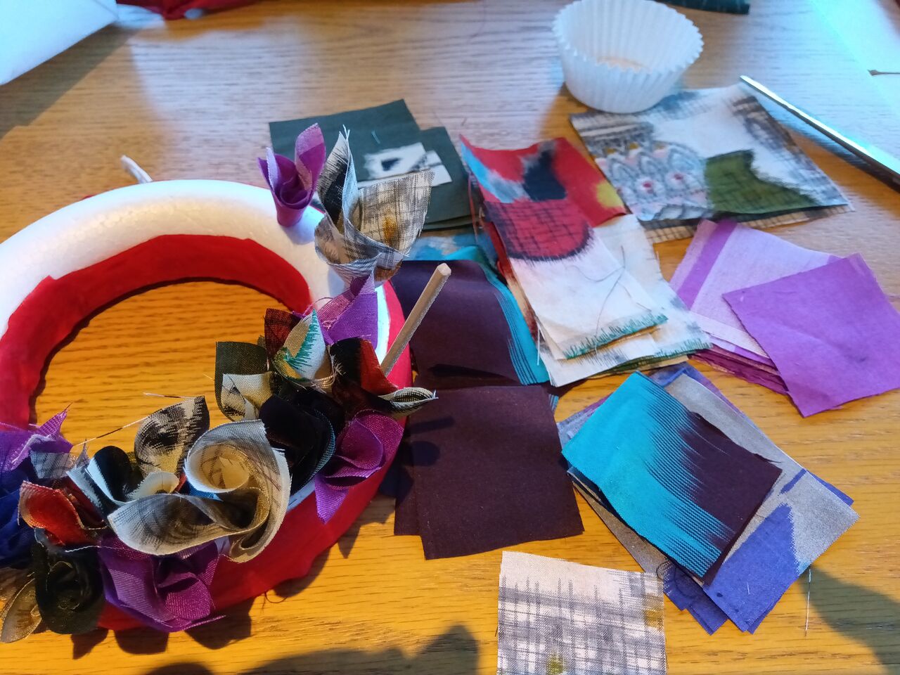 銘仙の端切れを四角に切って