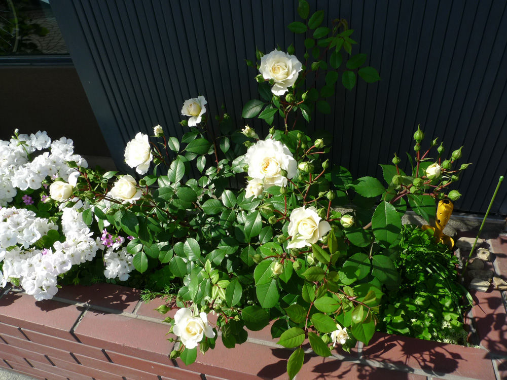 アイズの店先のバラが咲き始めましたよ。これからどんどん咲きます。これは「マルクアントンシャルポンティエ」なんて長ーい名前のバラ。香りがとてもいいんです。