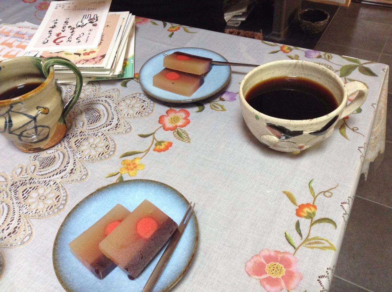 午前中に少し自宅で仕事をして、休憩中がてら今年いただいた年賀状の整理をしています。お茶受けは羊羹。お正月用に買っただけあってとってもめでたい感じですね。改めてお正月気分を味わっています。