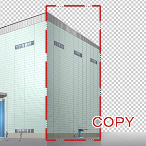 パース全体をコピーペーストし、複製されたほうのレイヤを切り抜きます。背景は非表示として作業し、透明部分がチェッカー模様で確認できるようにしましよう。直線的な建物なので、消しゴムツールで直線消しを行うと良いです。1点目をクリックし、2点目はShiftを押しながらクリックすると、2点間を直線的に消去できます。