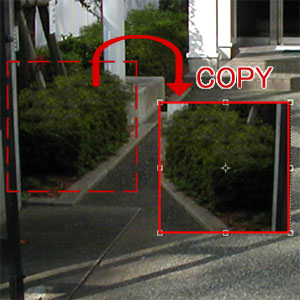 写真の樹木部分を「長方形選択ツール」で囲い、コピー&ペーストします。左右対称に植込みがあるので、「回転→レイヤを左右に反転」としたほうが、作業しやすそうです。