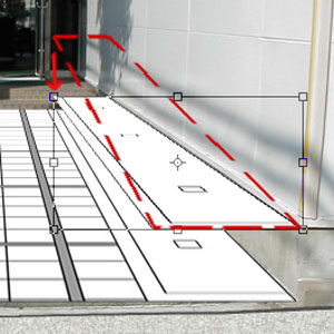 背景画像の上に平面図画像を貼り付けた上、「変形→自由な形に」を適用して画像の形状を変形していきます。変形の仕方は【立面図をパースに】の項などを参考にして下さい。