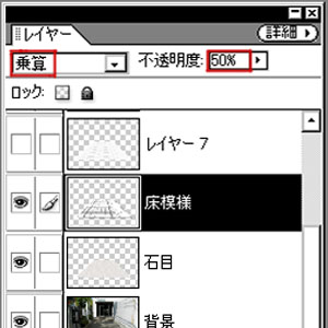 石テクスチャの上層に平面図レイヤがくるようにレイヤ順序を並べ変えます。平面図画像は描画モードを「乗算」として利用します。目地が目立ちすぎる場合は、不透明度を適度に調整します。