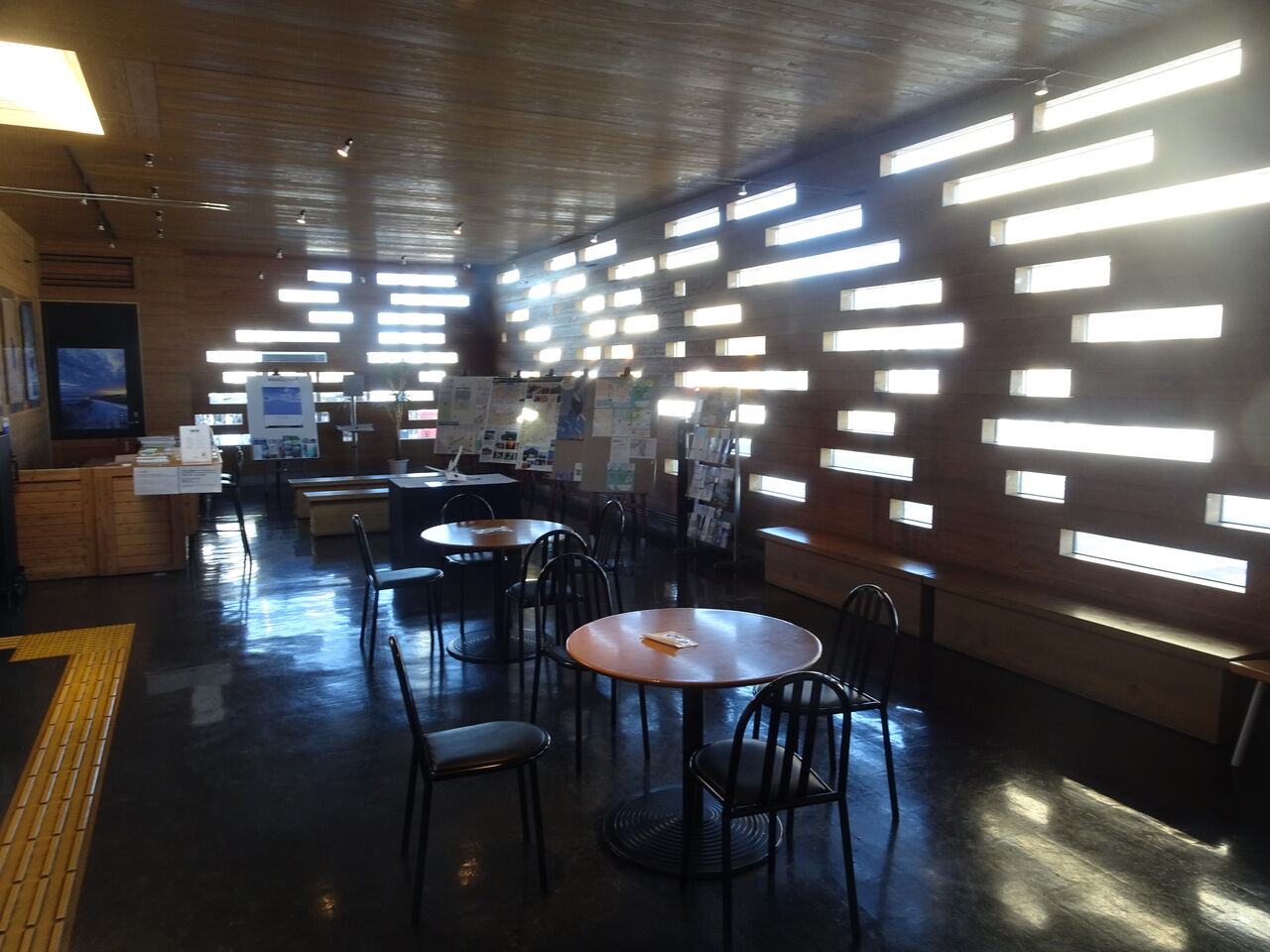 斜里町の中心部目指します。知床斜里駅、観光案内所、無人でした。洒落乙な外壁からの木漏れ日。駅前にバスターミナルの建物も有り。高速バスはライバルだろうけど待合室とか共有すればいいのに、ただでさえ人居ないのだから。洒落乙な駅も地元支援で建てたろうに。