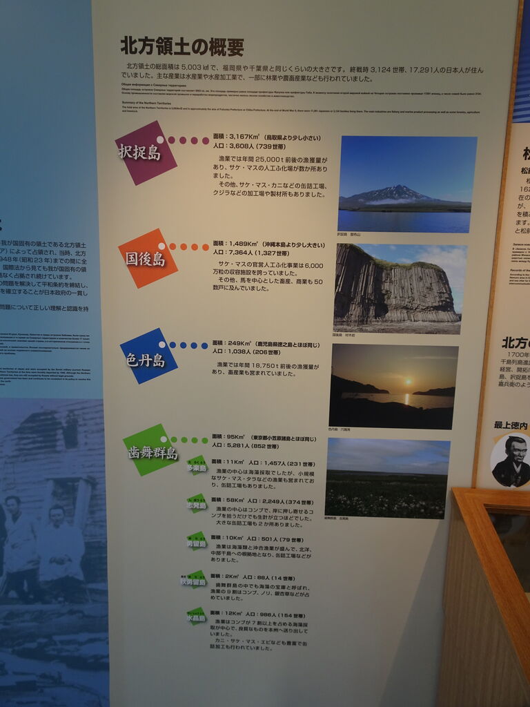 標津町の海沿いの道の駅、北方領土を見れる展望施設。択捉島が沖縄より大きいのは知ってましたが、鳥取に迫る大きさだったとわ!国後で沖縄サイズなんですね。