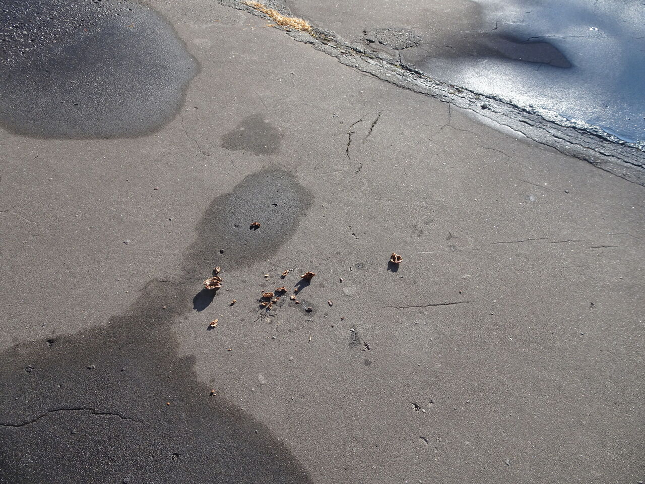 駐車場でカラスが木の実を置いていって、ここじゃ1日10台も通らないだろうと思い、私が踏んで割ってあげると、その後、食べた模様。