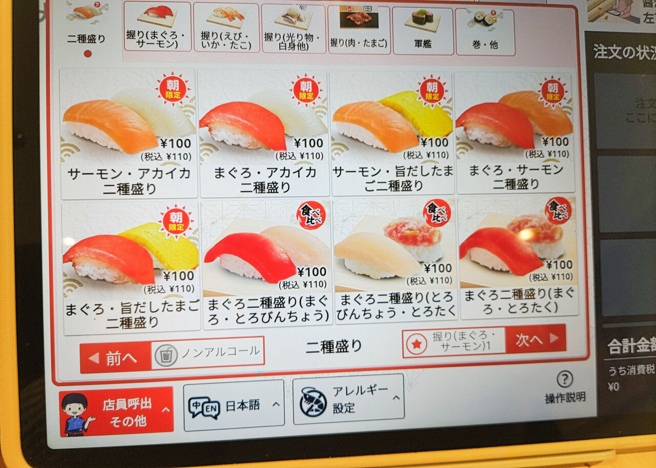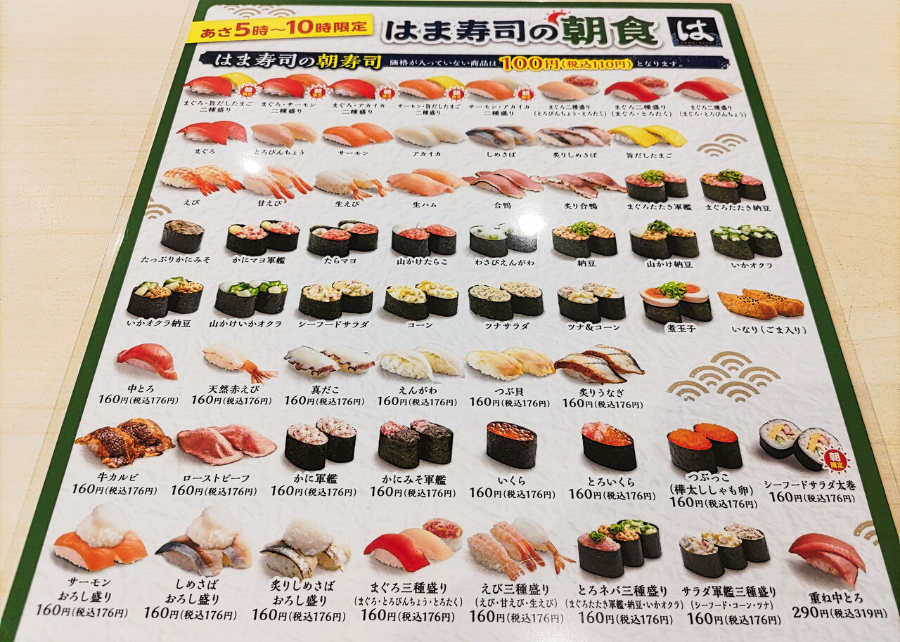 お寿司は、はま寿司の朝食として扱うお寿司のうち、6割ほどものが110円にていただくことができます。