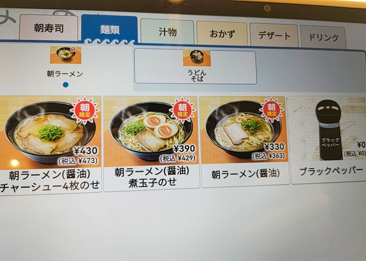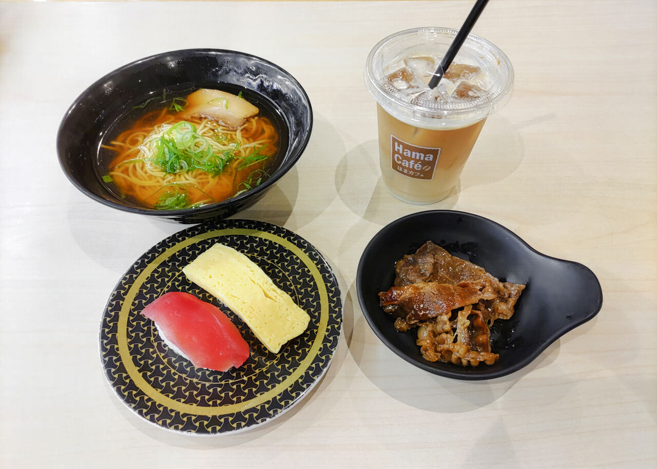 朝ラーメン 醤油(363円)、まぐろと旨だしたまごの2種盛り(110円)、牛肉カルビ(176円)、アイスカフェラテ(110円)いただくことにします。