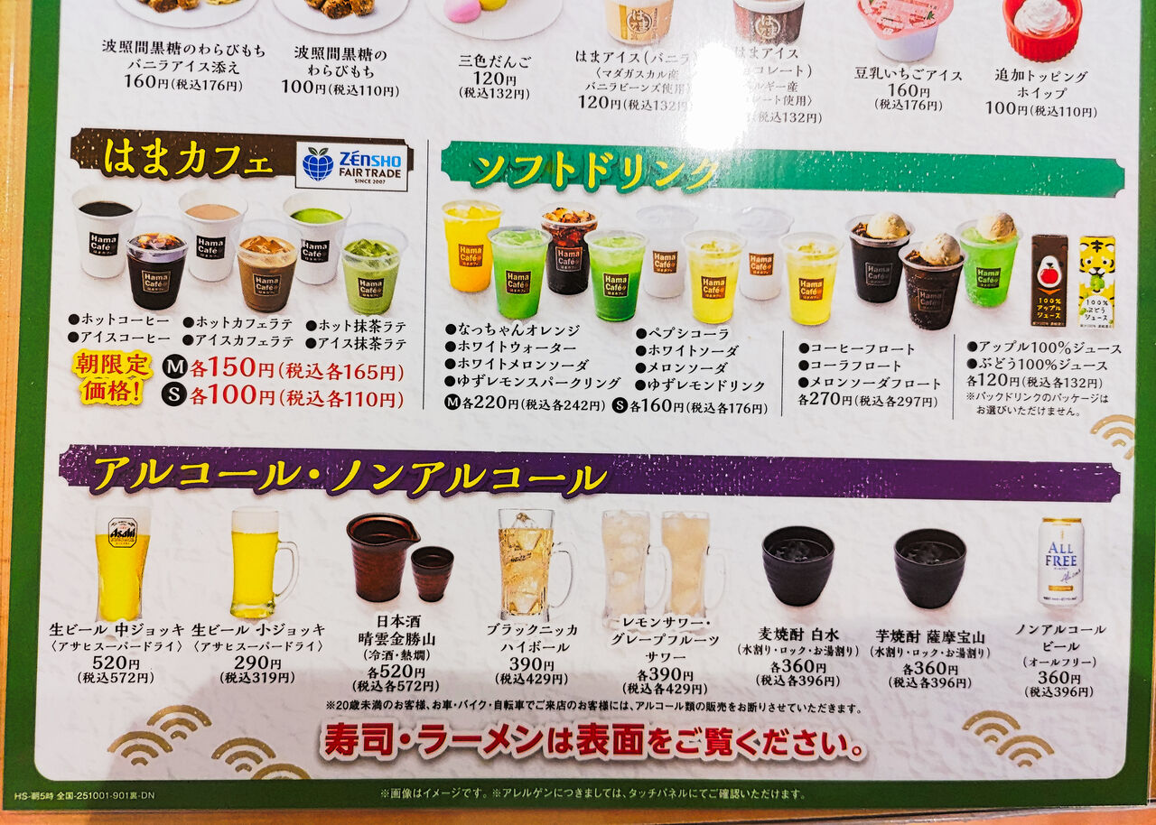 お飲み物は、コーヒー、カフェラテ、抹茶ラテ、ジュースなどのソフトドリンク、ビール・日本酒・焼酎・ハイボールなどのアルコールドリンク、ノンアルコールがメニューにあります。