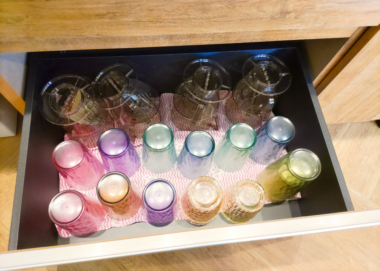 お飲み物を淹れるために必要なカップやグラス、ドリッパーは、ドリンクバーの棚の引き出しに収納されています。