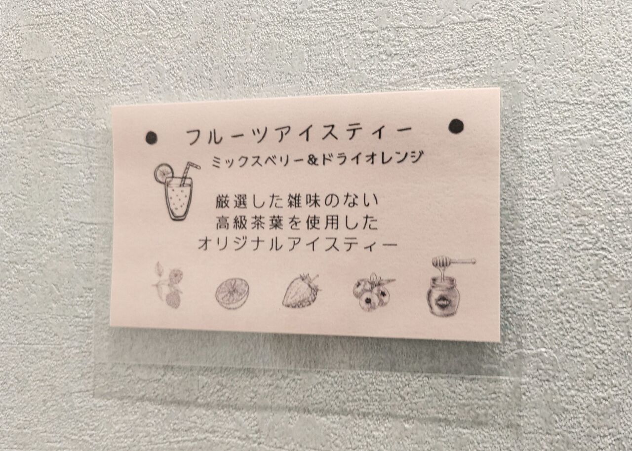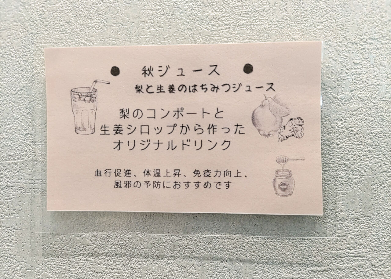 フルーツアイスティーはミックスベリー&ドライオレンジ、季節のジュースは秋のジュースとして梨と生姜のはちみつジュースがいただけます。